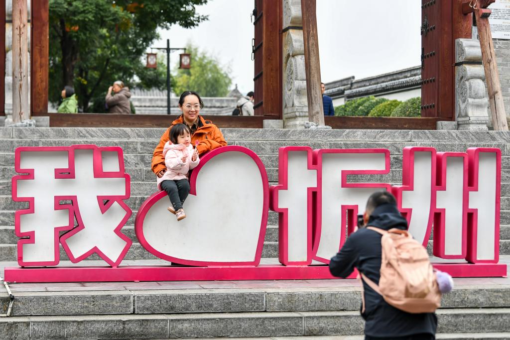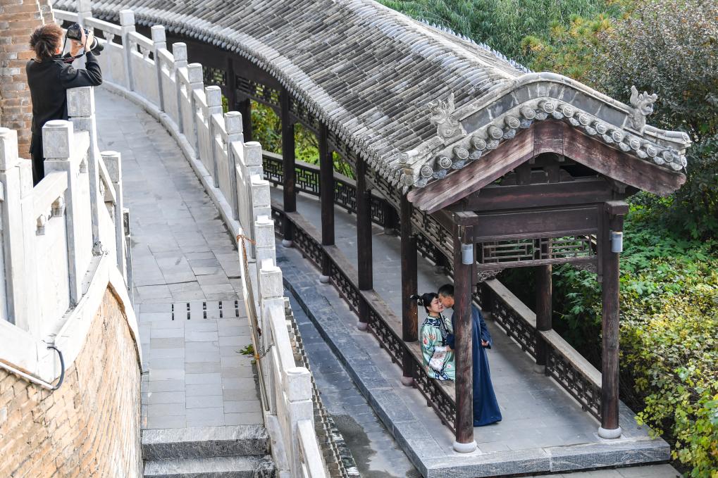 游客在忻州古城内拍照留念。