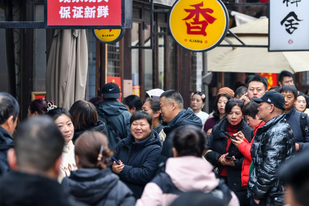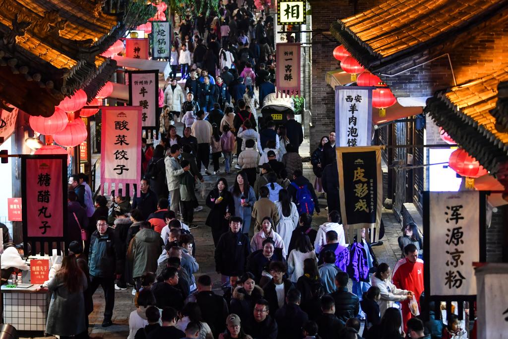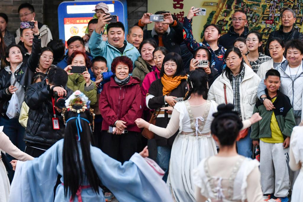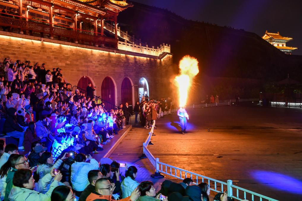 游客在忻州古城内观看表演。