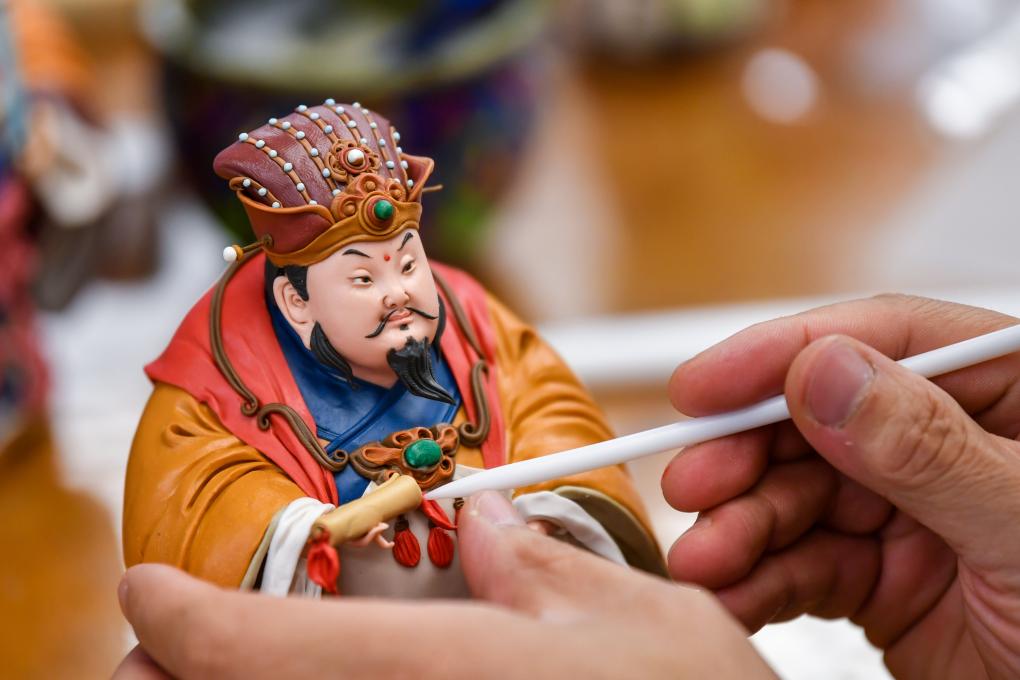 面塑技艺非遗传承人卢佩宏在忻州古城的工作室里制作面塑。