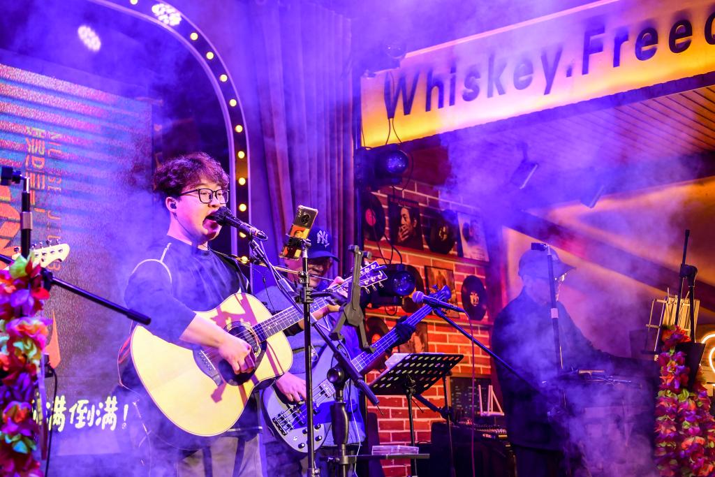 忻州古城内一家酒吧的乐队表演。