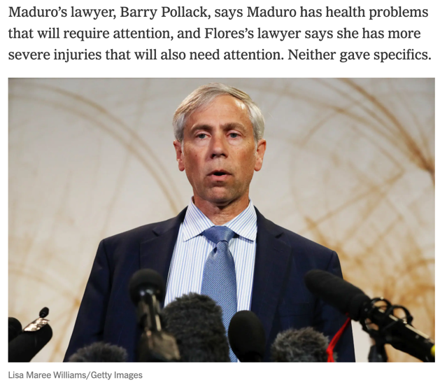 △《纽约时报》报道,马杜罗辩护律师表示,他可能会就马杜罗作为主权国家元首的角色提出动议,并称马杜罗健康状况需要治疗。