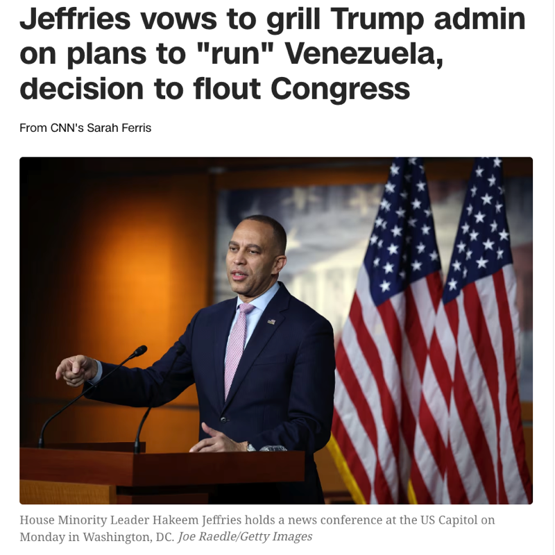 △CNN报道,众院少数党领袖杰弗里斯称,要就特朗普政府“控制”委内瑞拉的计划以及藐视国会的决定对特朗普政府进行质询。