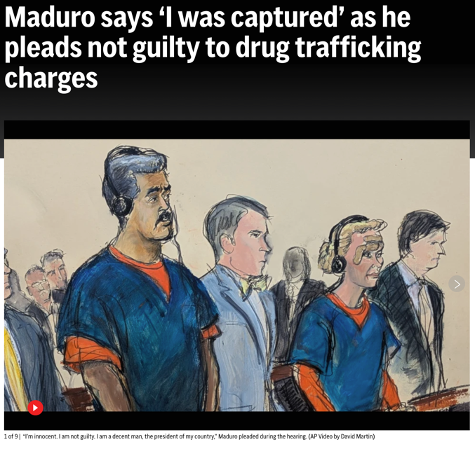 △美联社报道,马杜罗出庭时对贩毒指控拒不认罪,他进入法庭时还向记者们祝福新年快乐,反复强调自己是被非法绑架。