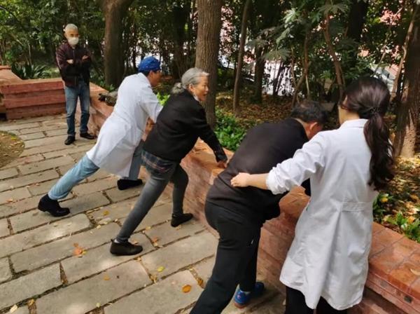传统的卧虎扑食势要求十指撑地、俯卧,这对帕金森病患者来说难度太大。为了适配患者的身体条件,团队进行了优化,把俯卧改成站姿,让患者双手平撑在桌子上,保留抬头挺胸、十指支撑、后足大趾发力等核心要点,既确保疏肝理气、舒展胸廓的导引功效,又兼顾安全性与可持续性,让体弱患者也能坚持练习。